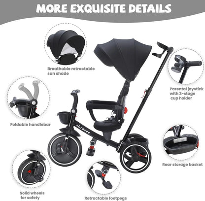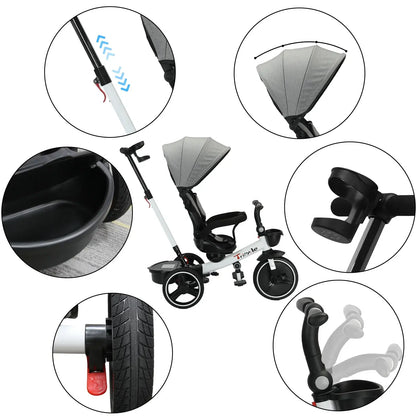 This versatile stroller tricycle transforms from a parent-controlled stroller to an independent trike, growing with your child from ages 1 to 5.