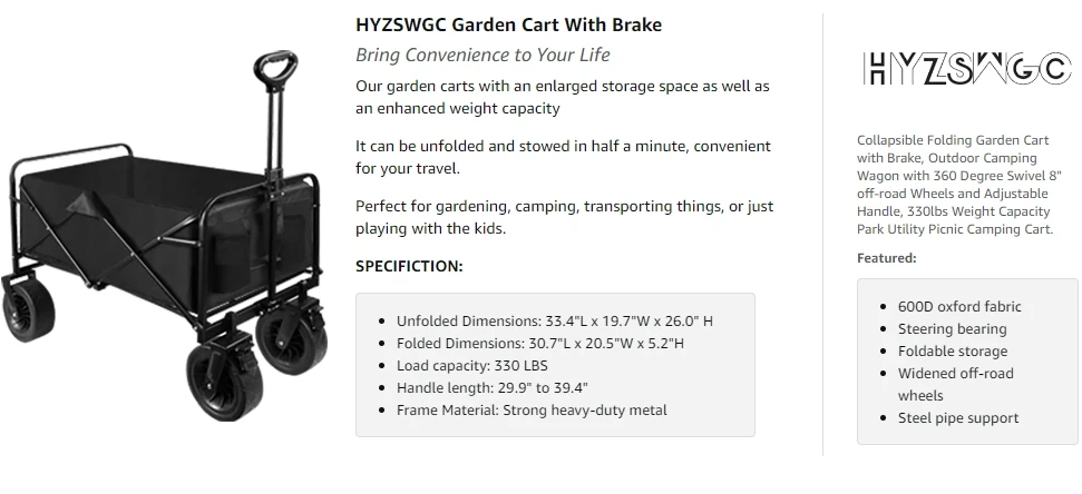 Built with a sturdy metal frame that supports up to 330 lbs (150 kg), this wagon offers exceptional strength for all your hauling needs. The 600D Oxford fabric with PVC coating is both waterproof and tear-resistant, ensuring durability and long-term use in any weather condition.