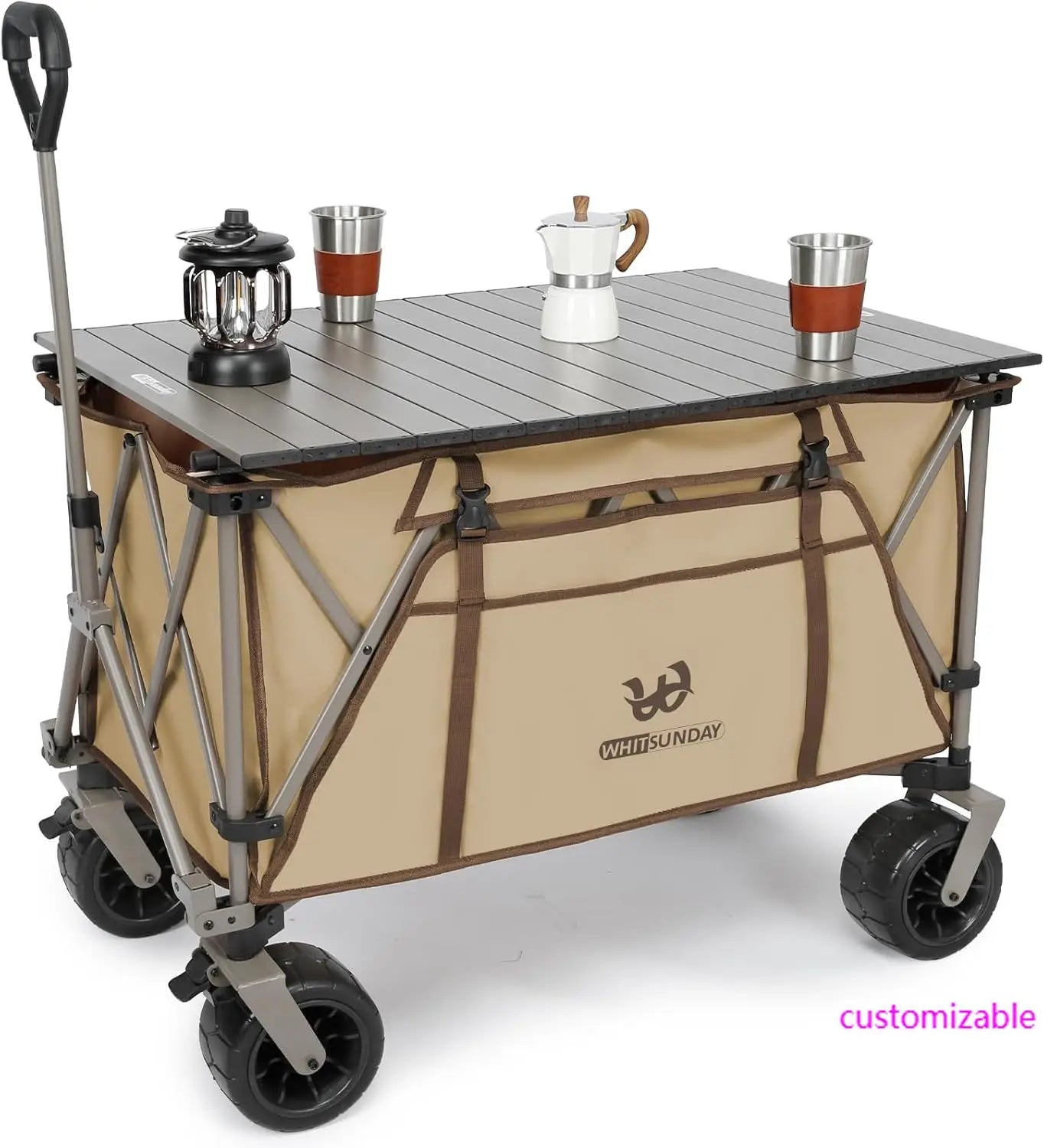 This Folding Wagon with Table Top combines heavy-duty durability, all-terrain mobility, and multifunctional design in one portable, collapsible wagon. With ample storage, versatile accessories, and user-friendly features, it is ideal for outdoor adventures, family outings, and everyday tasks.